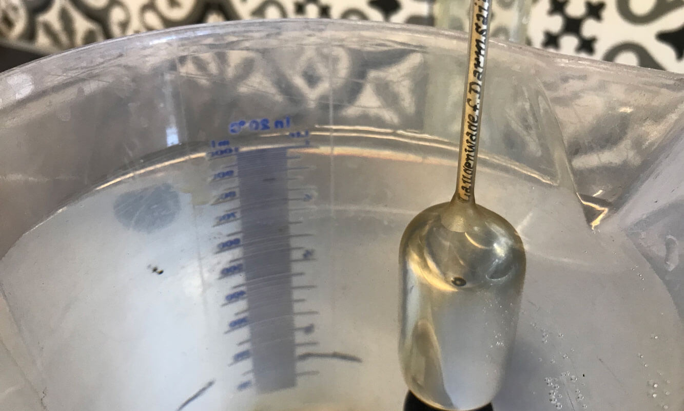 The concentration of the dissolved wine lees is measured using a hydrometer.